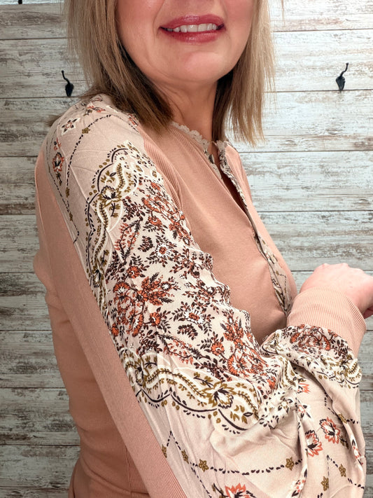 Printed Sleeve Ribbed Henley Top