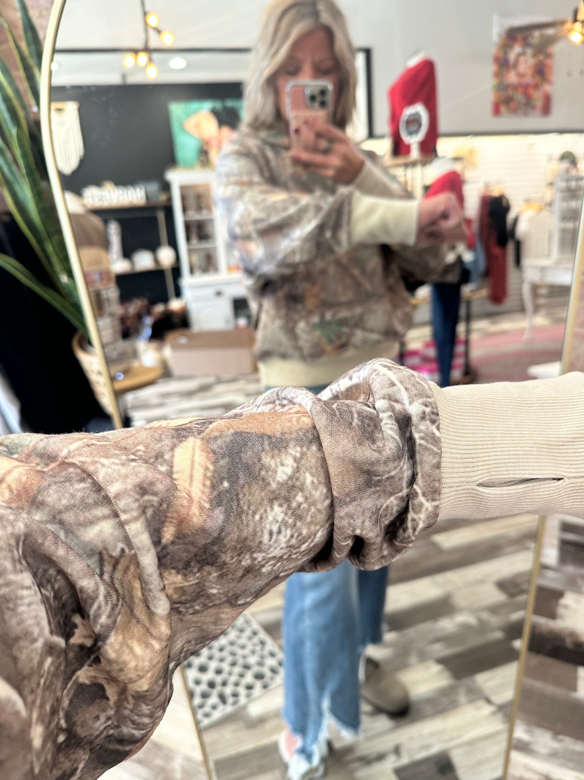 Our cute new camo washed hoodie offers a perfect blend of comfort and practicality. Crafted from high-quality fabric, this pullover has a relaxed fit and comes with a front pocket, zip up neckline and hoodie. Semi crop length (covers belly and past top of waist!) Not too short or too long! Perfect! Of course!!! - thumbholes are present! Kari is in the L/XL.