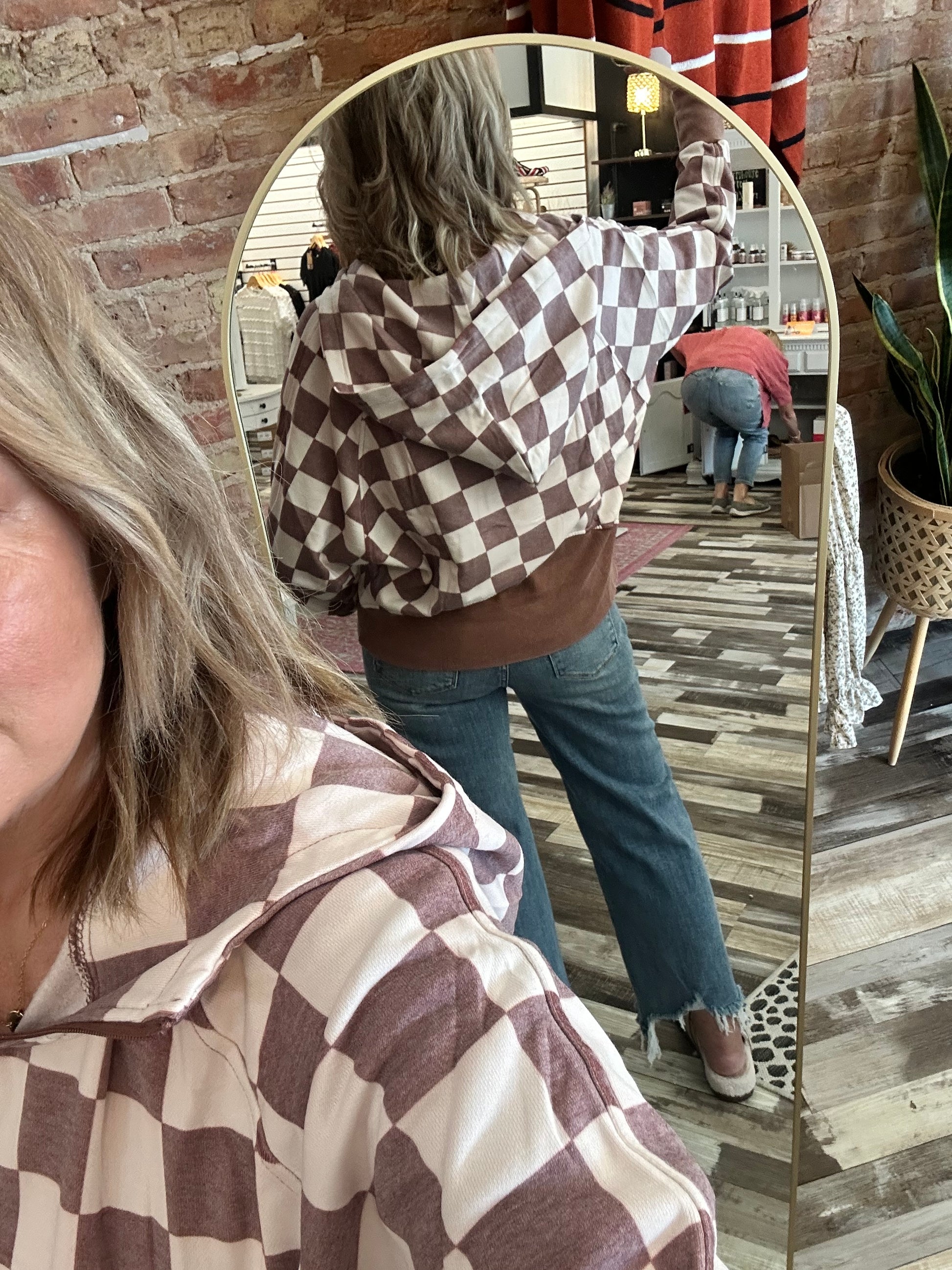 Our cute new camo washed hoodie offers a perfect blend of comfort and practicality. Crafted from high-quality fabric, this pullover has a relaxed fit and comes with a front pocket, zip up neckline and hoodie. Semi crop length (covers belly and past top of waist!) Not too short or too long! Perfect! Of course!!! - thumbholes are present! Kari is in the L/XL.