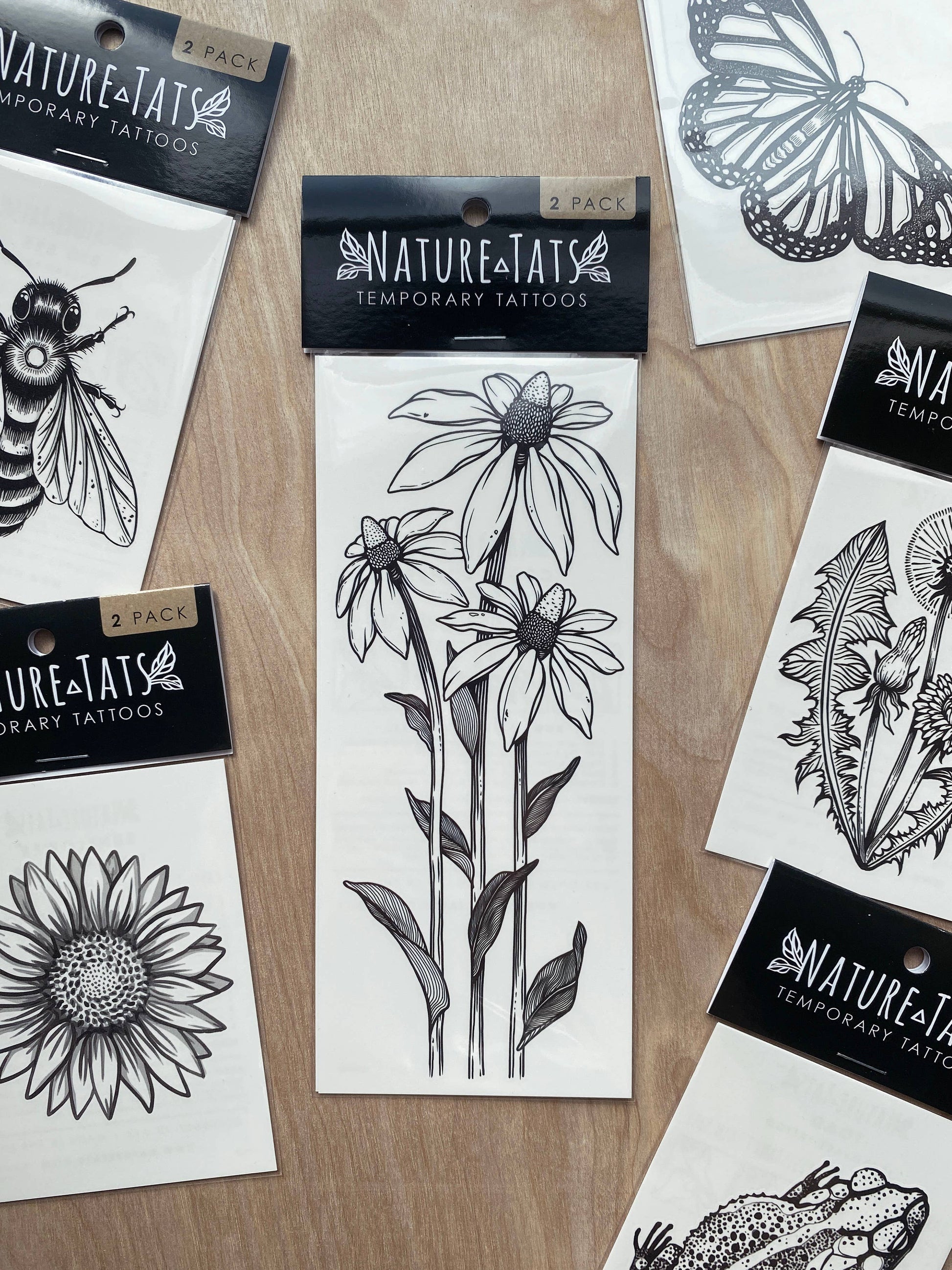 Coneflower temporary tattoo. This design features a bouquet of three coneflowers, inspired by the beautiful yellow Texas coneflowers. They stand tall with detailed leaves that clasp to their stems, whimsically wild petals, and an upright position just waiting for sunshine and pollinators. This design is one of many native Texas wildflowers to be added to my collection, it pairs wonderfully with our Bluebonnet tat.