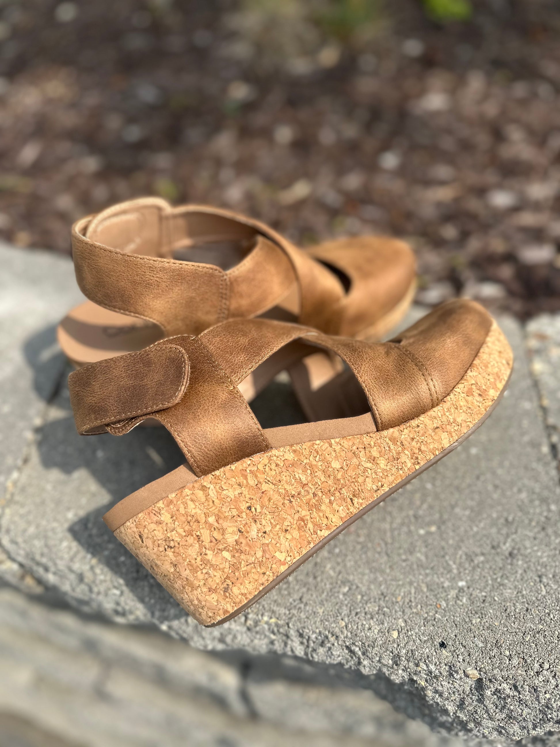 Step into cozy-chic style with these tan crisscross cork wedges. With wide straps, a closed toe, and cushioned insole, these sandals deliver comfort, coverage, and a splash of color—perfect for transitioning between seasons or adding earthy flair to your look.