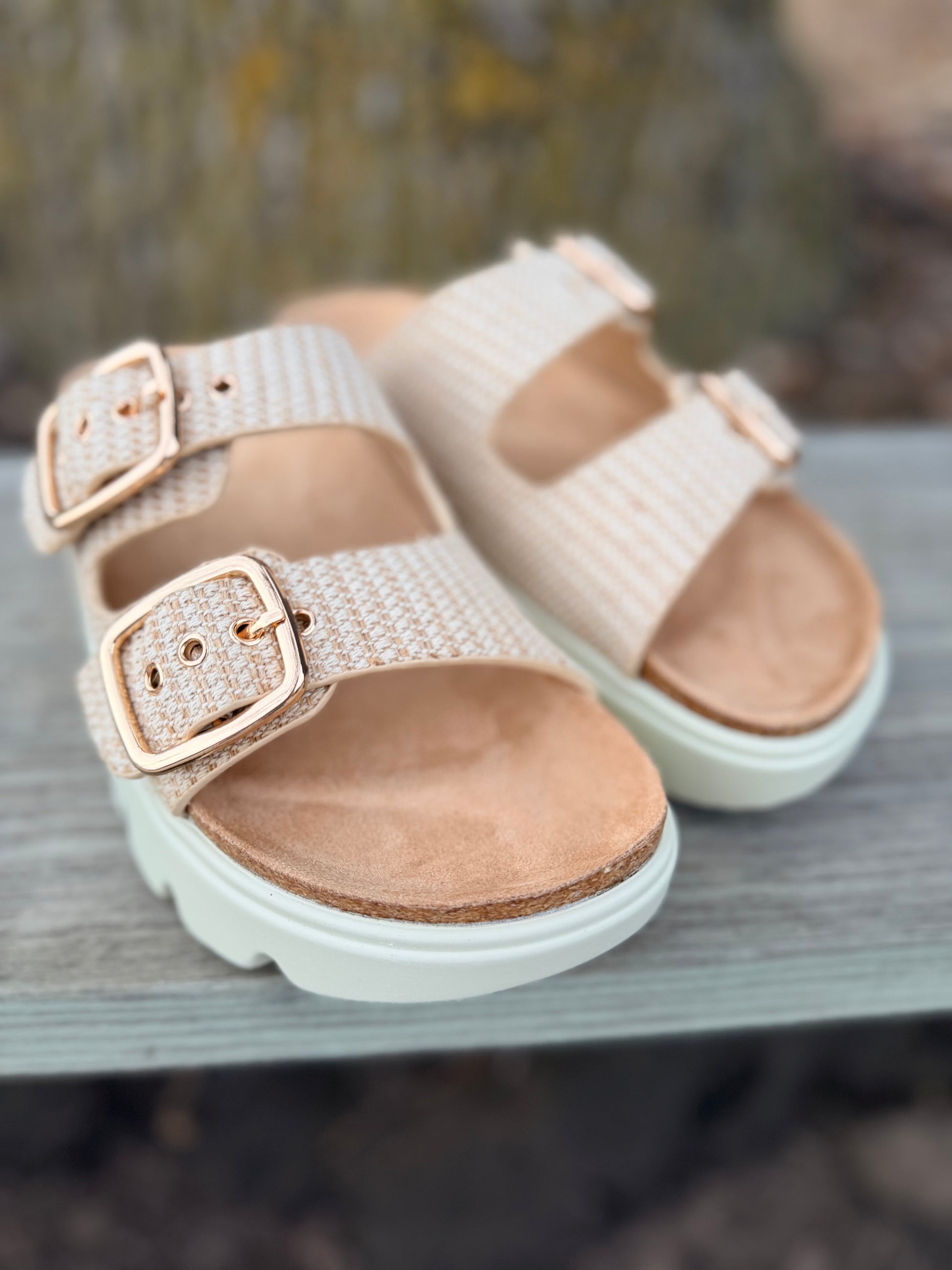 These chunky sandals are a must have! These slip on sandals have a light tan weaved texture. There are two straps that go across the front and are adjustable with two gold buckles on each strap. The sole of the shoe is a cork material and the bottom of the shoe is a chunky white rubber like texture.