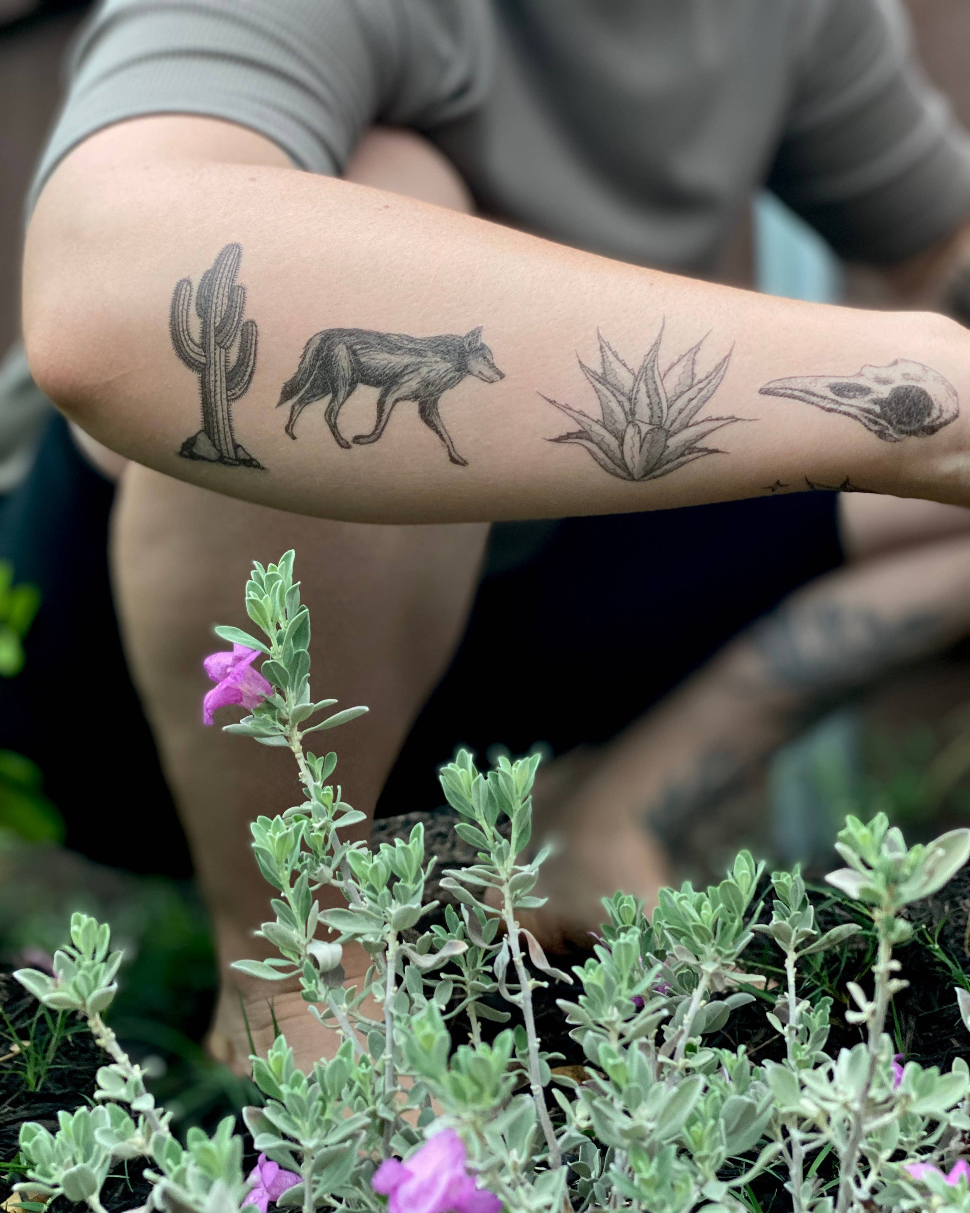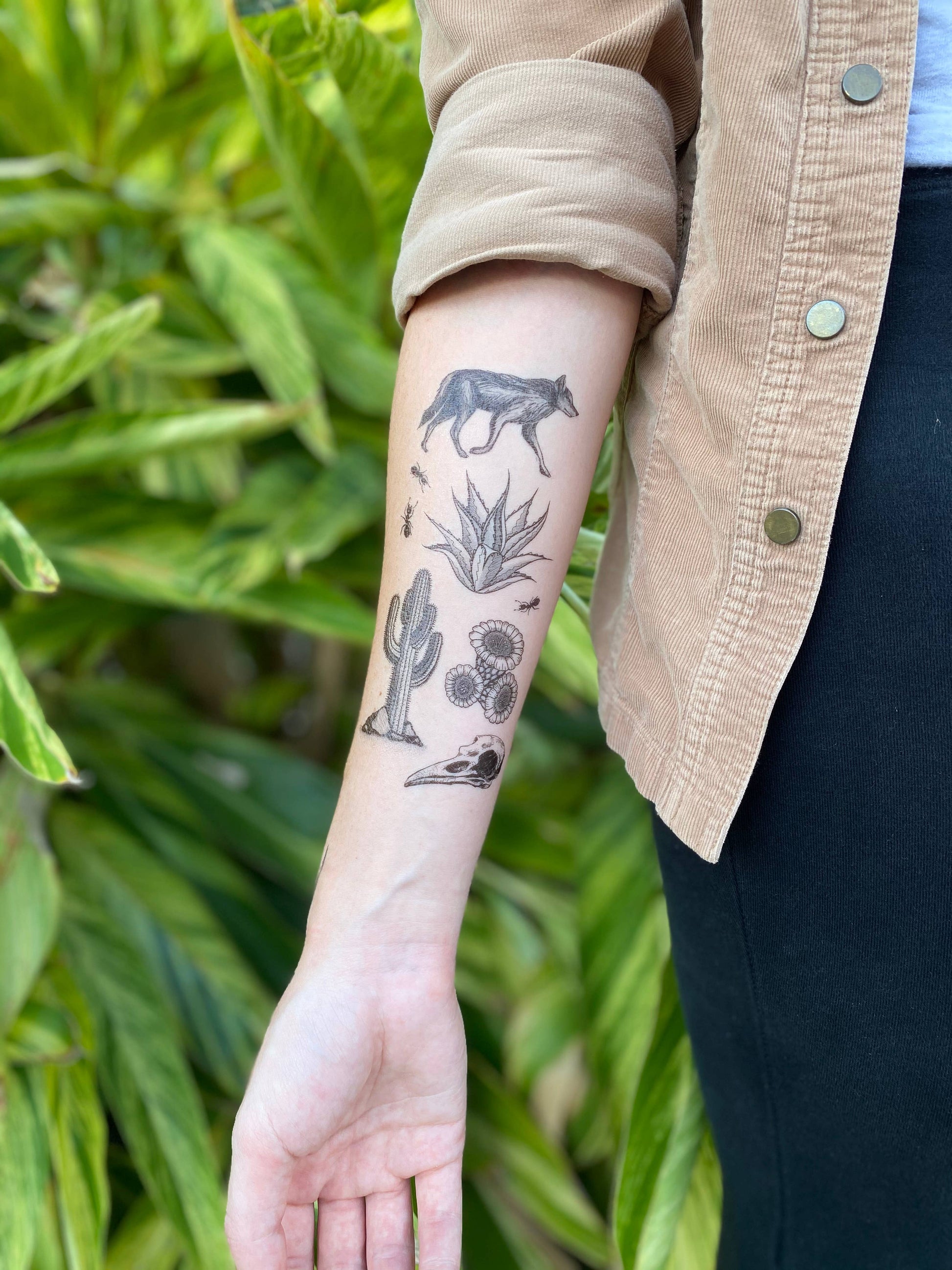 Desert Wild temporary tattoo. A collection of temporary tattoos inspired by the American southwest desert. These designs truly represent the rough yet lively wilderness. It includes a coyote, spikey agave, mighty saguaro, cactus flower, bird skull, and three fire ants.