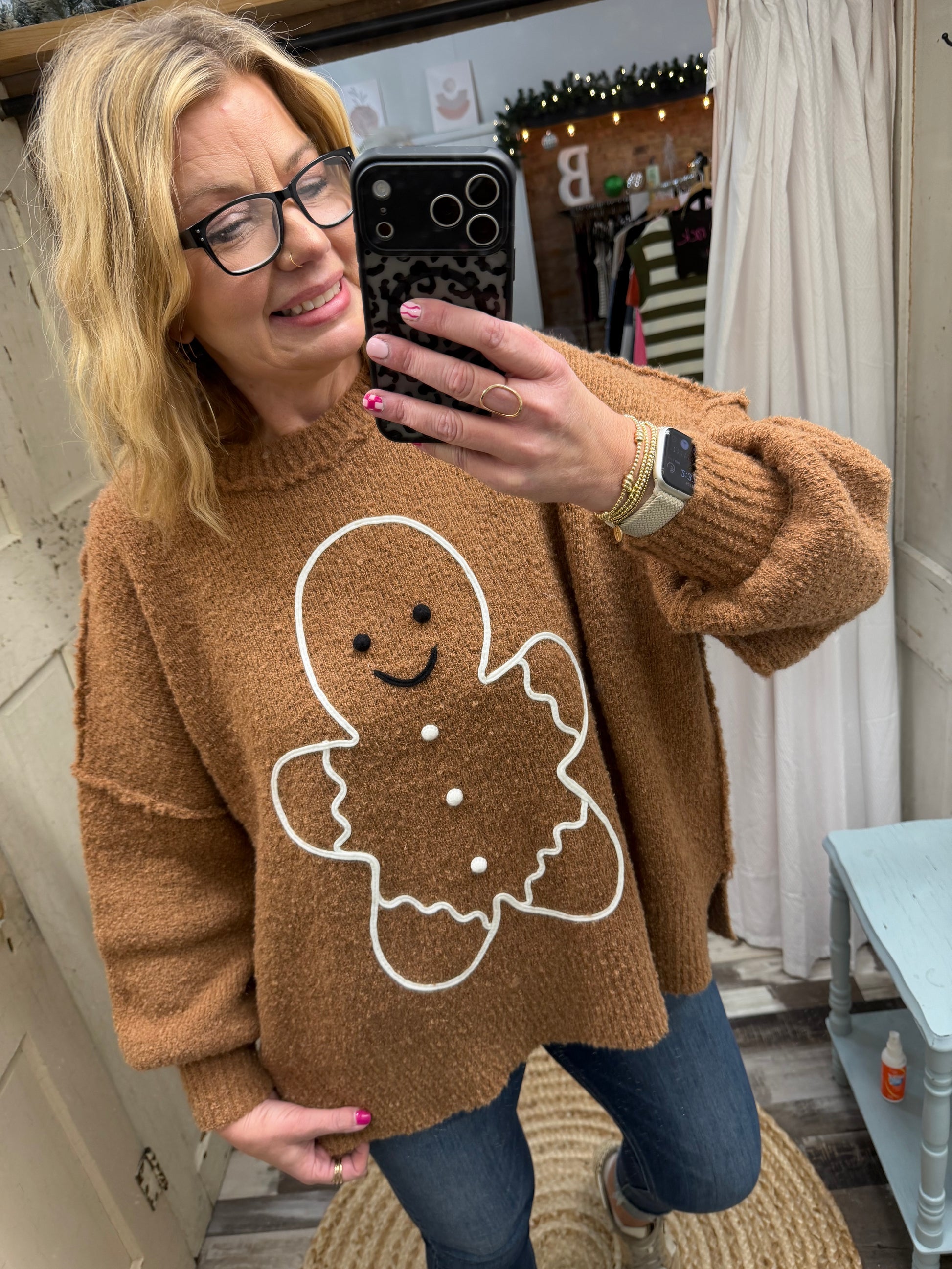 Wrap yourself in cozy holiday charm with this oversized gingerbread man sweater. Crafted from heavyweight fabric, it's perfect for staying warm while spreading festive cheer. The playful gingerbread design brings whimsical character to your seasonal wardrobe, whether you're lounging at home or heading out for holiday gatherings. Comfortable, durable, and undeniably fun—this sweater is your new go-to for all things merry and bright.