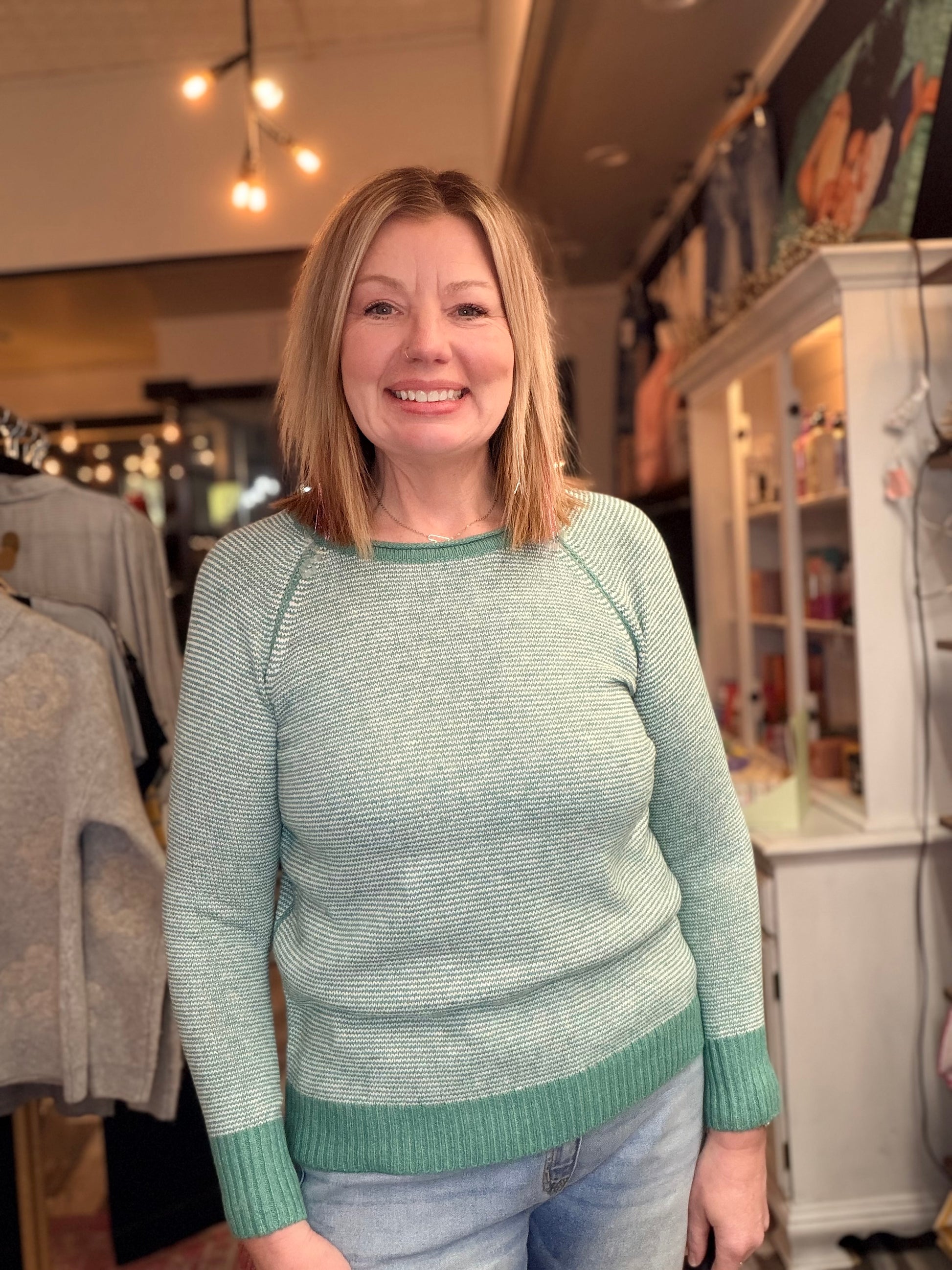 Light jade color trimmed long sleeve pinstriped pullover sweater.