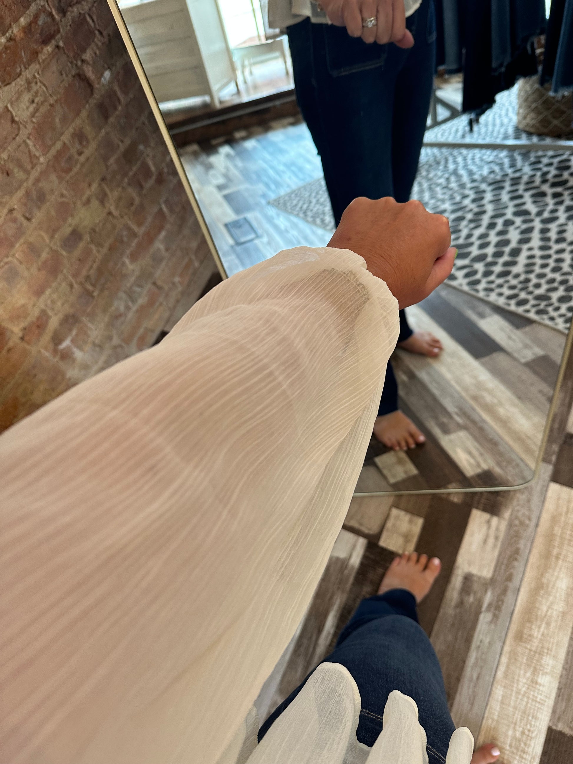 Achieve effortless elegance with this semi-sheer drawstring blouse. Designed with a flowy silhouette, adjustable drawstrings at the neckline, and billowy long sleeves, this blouse strikes the perfect balance between comfort and style. The lightweight, airy fabric adds a soft and feminine touch.