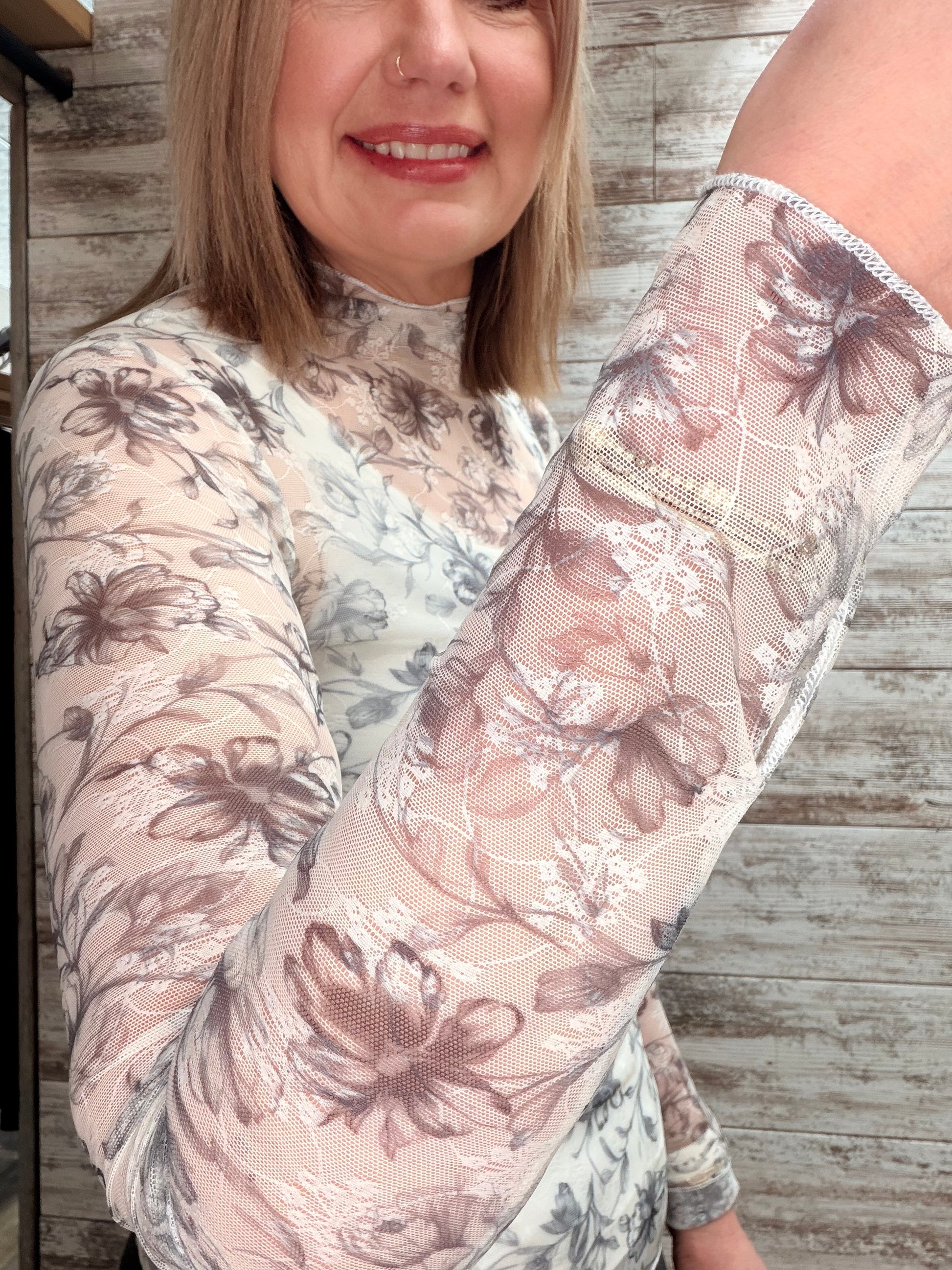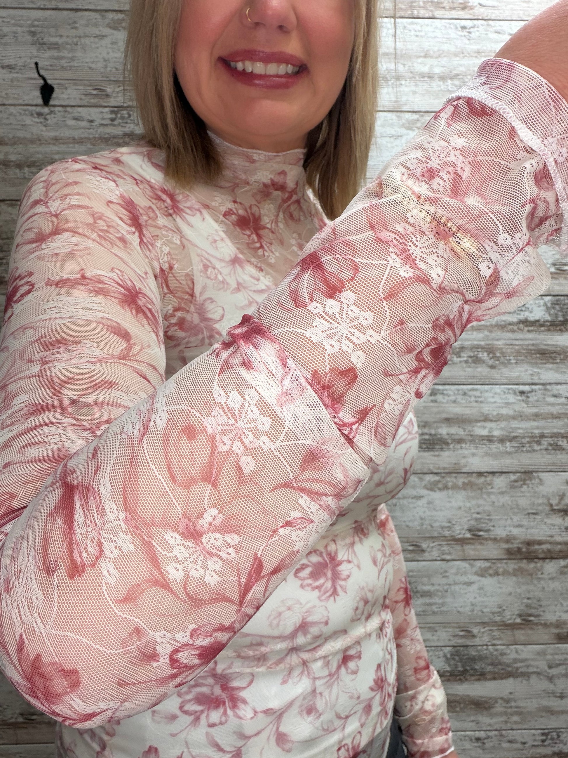 Twirl into spring with this delightfully airy mesh top! Featuring a charming floral print that dances across lightweight fabric, it's perfect for layering or wearing solo. The high neckline keeps things polished while the slim fit flatters your silhouette, and those adorable ruffle-trimmed long sleeves add just the right amount of flirty flair. Effortlessly chic and oh-so-wearable.