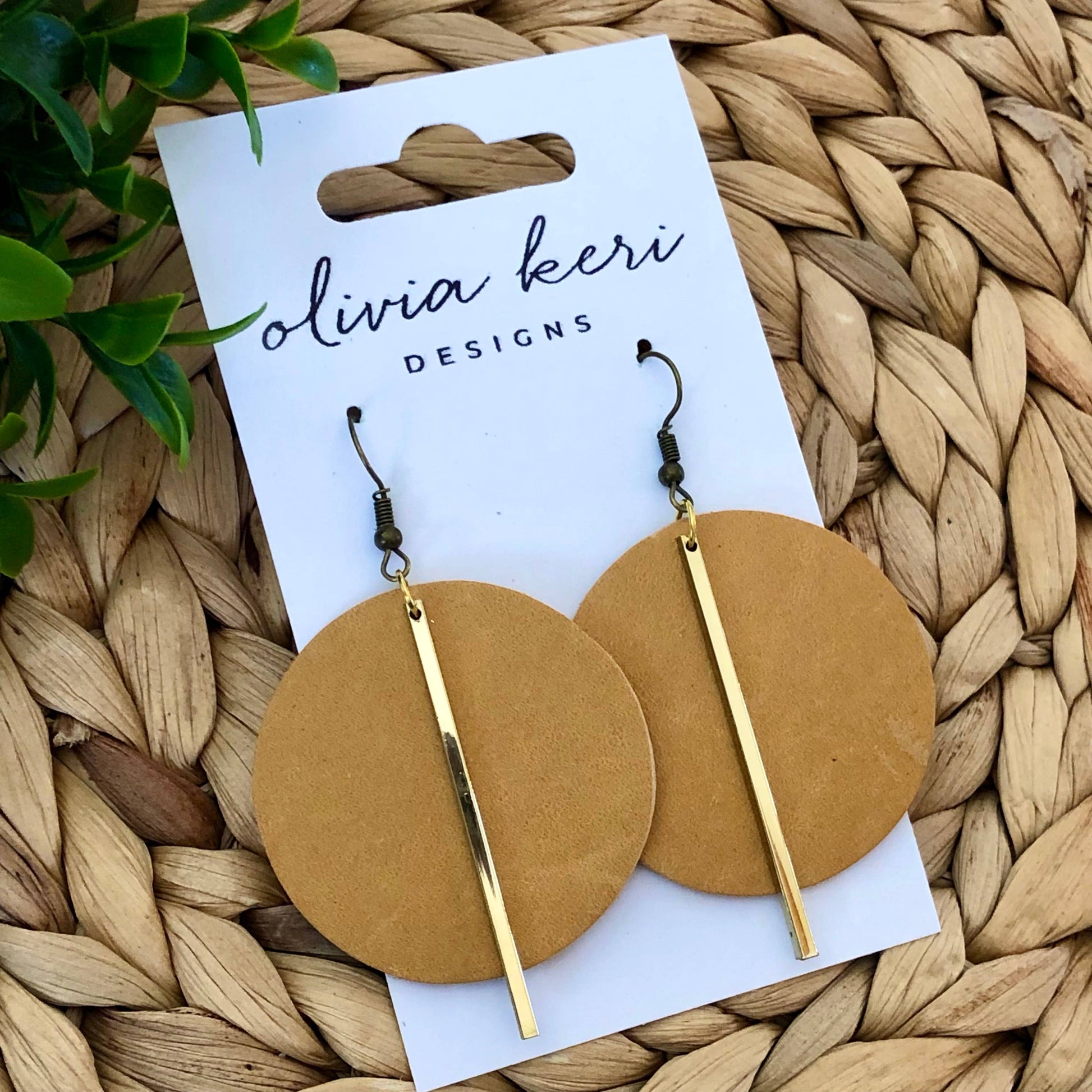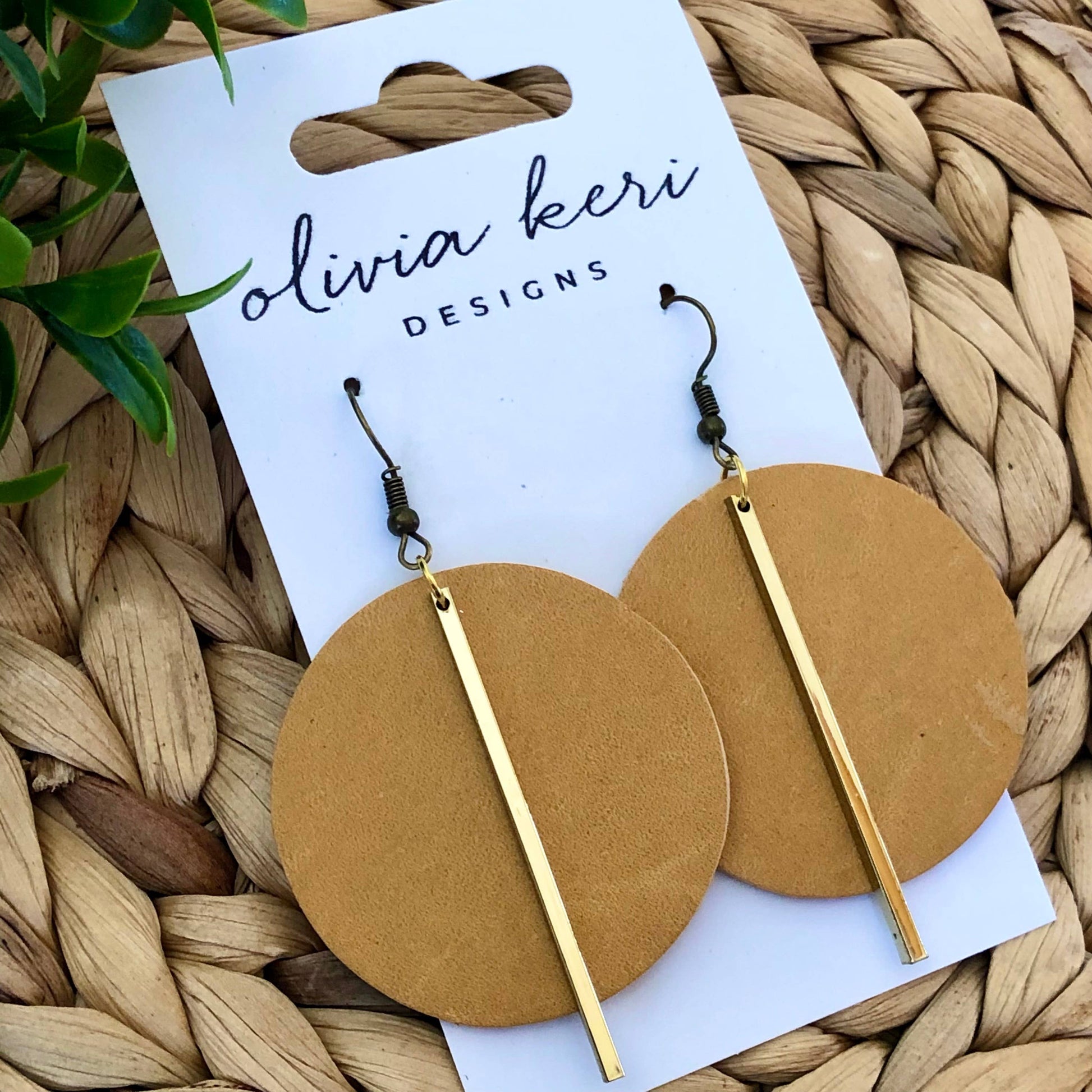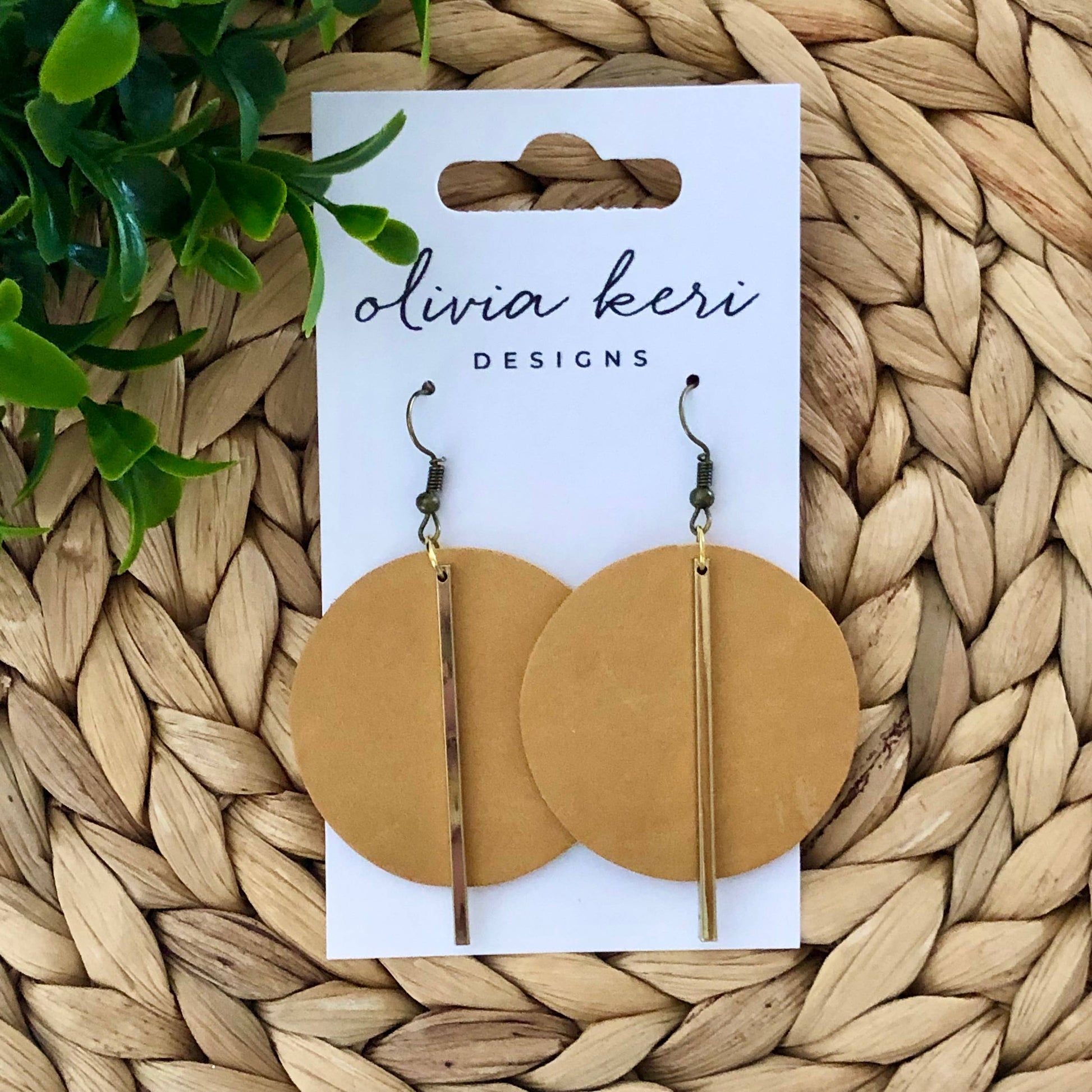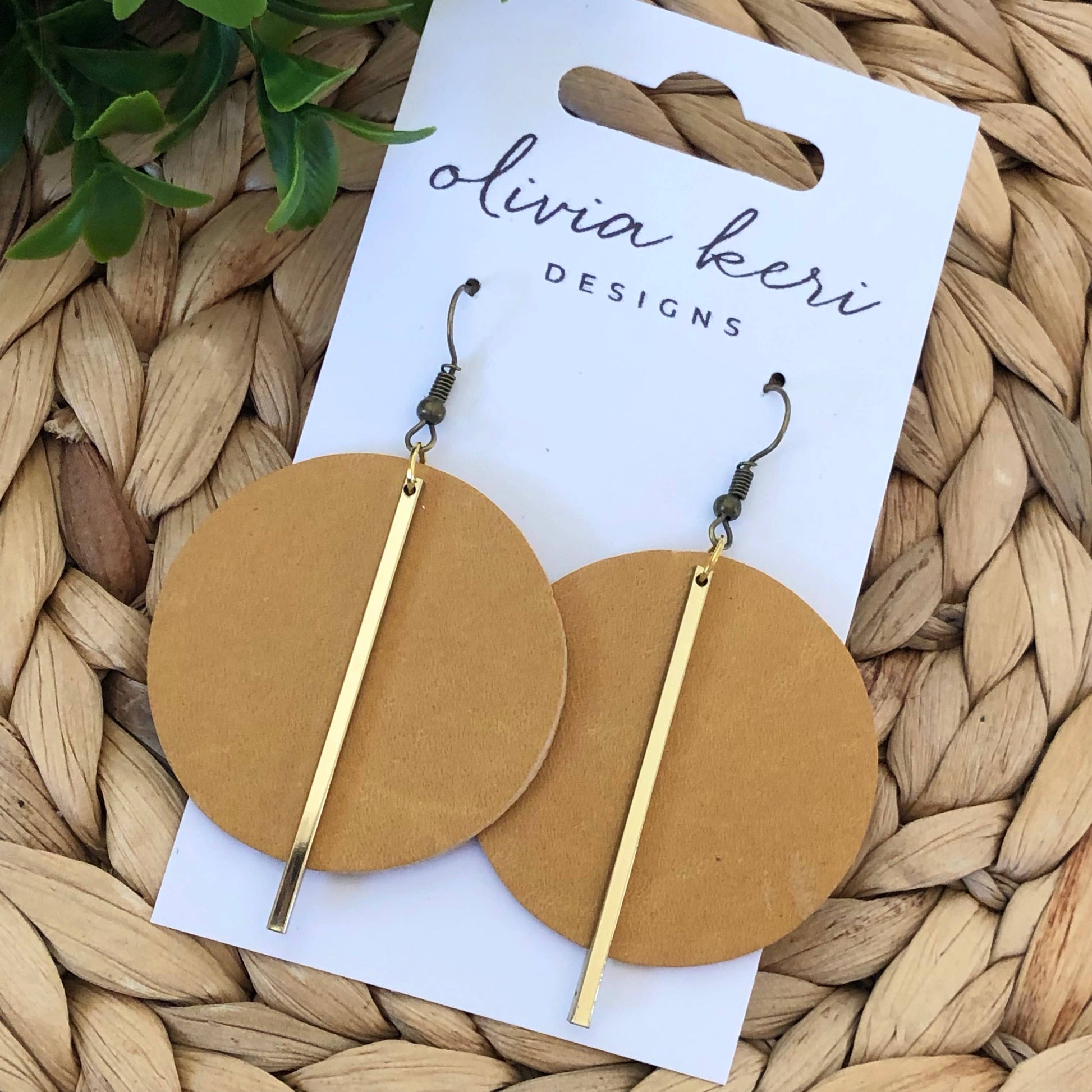 Beautiful honey round leather earrings featuring a gold bar accent.