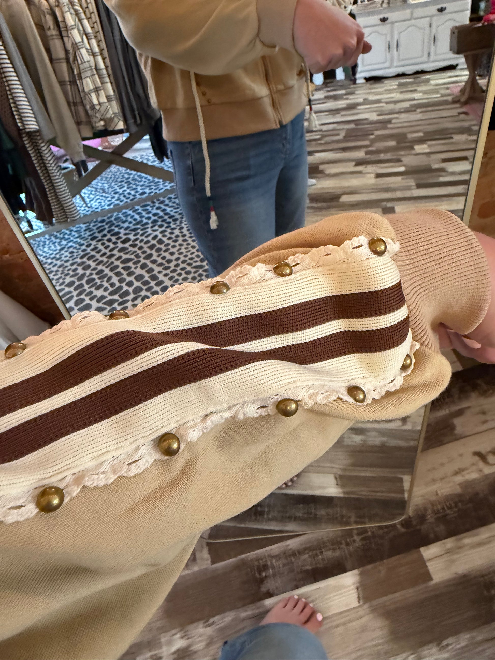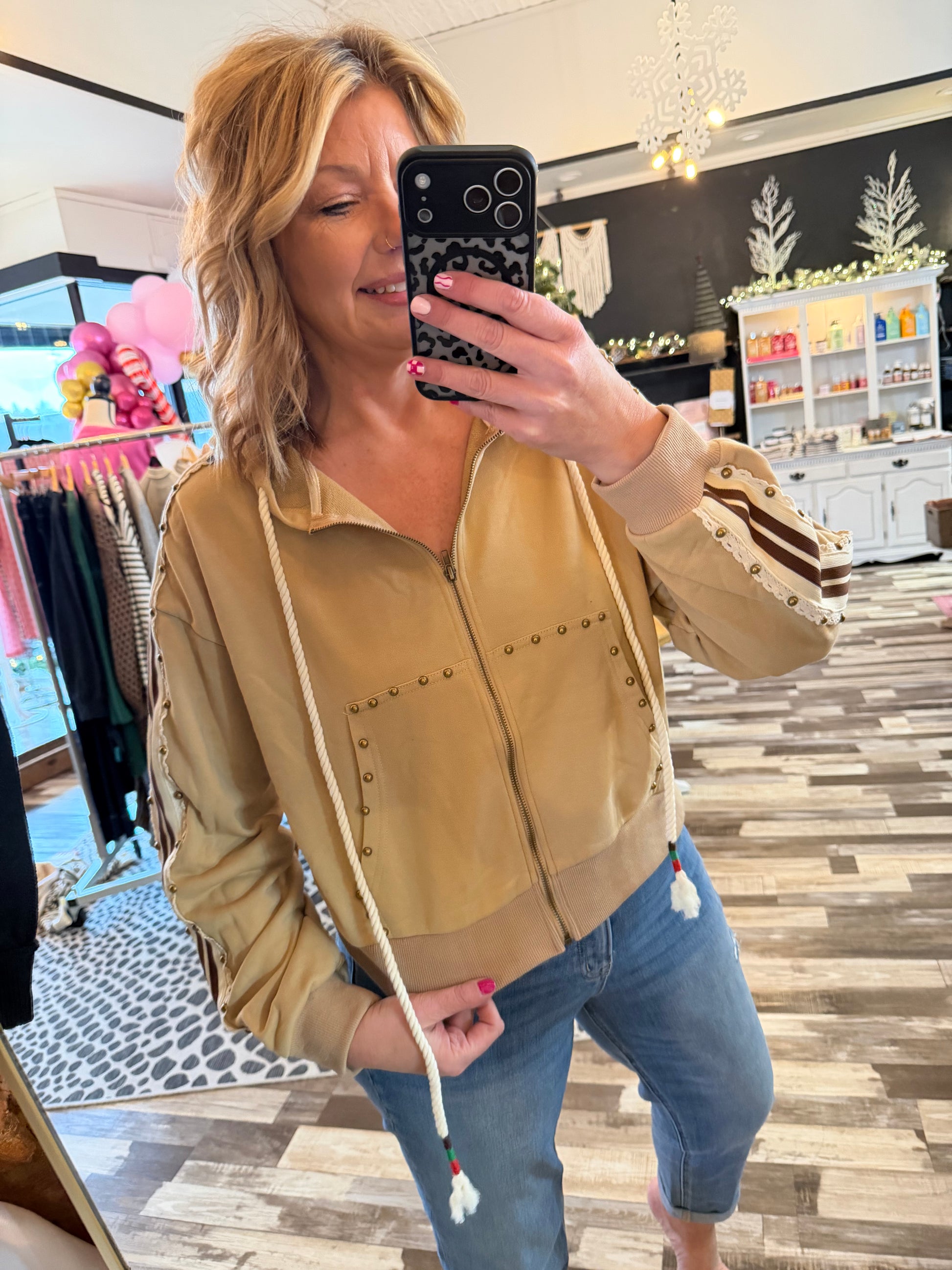 Wrap yourself in cozy vibes with this POL hooded jacket that's anything but basic. Crafted from soft french terry, it features playful striped elastic trim tape, delicate lace-bordered accents, and edgy stud embellishments that give it serious personality. The accented drawstring ties the whole look together for a jacket that's equal parts comfort and cool. Perfect for layering with attitude.