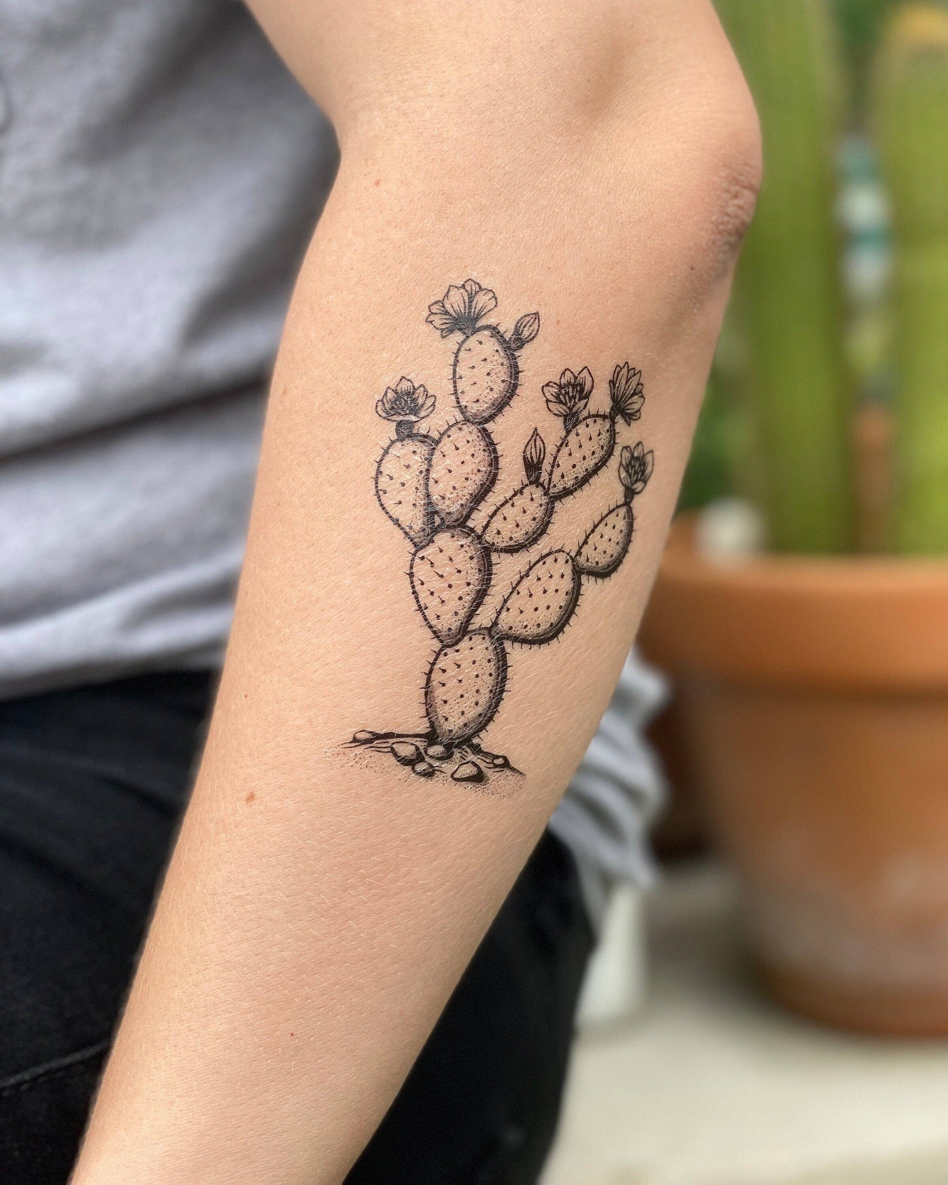 Prickly pear cactus temporary tattoo! The design features a 2.5 x 3.5 inch blooming prickly pear cactus, hand-drawn with black lines, stippling and texture.