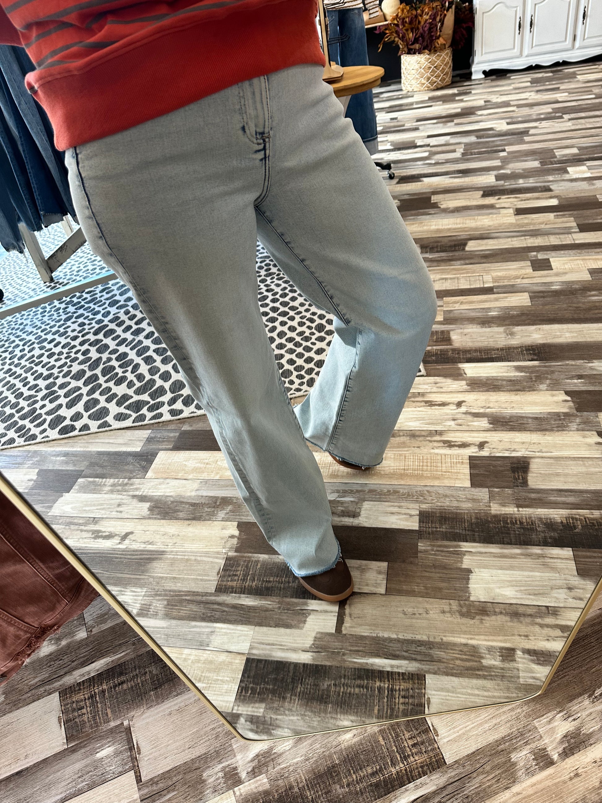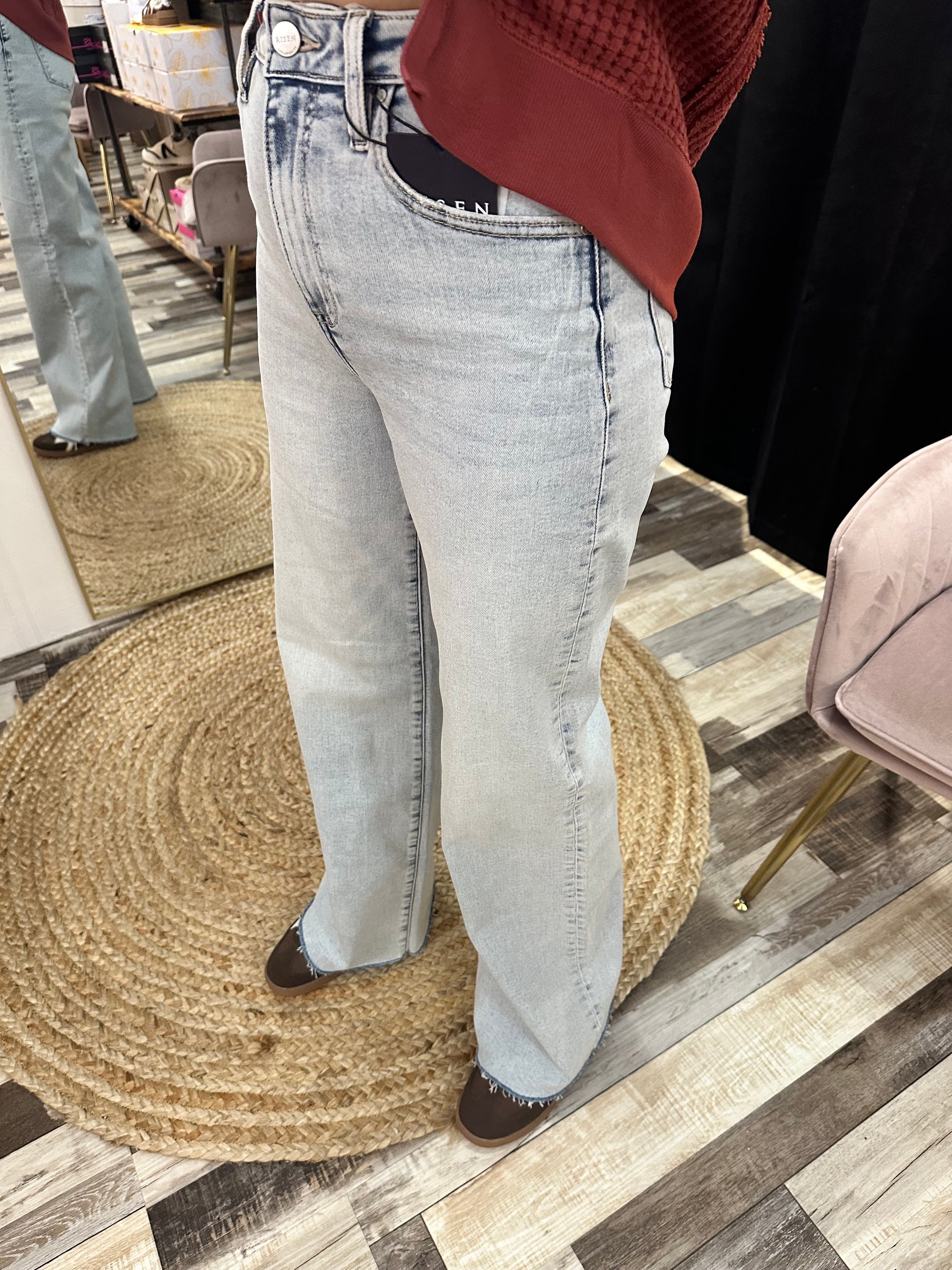 Step into effortless style with the Risen High Rise Wide Leg Denim. These jeans hug your waist to highlight your curves while offering a breezy, wide-leg fit that moves with you. Perfect for those who love a vintage vibe with a modern twist, they pair beautifully with everything from sneakers to heels for days when comfort meets cool. Ready to turn heads? These jeans have got you covered.