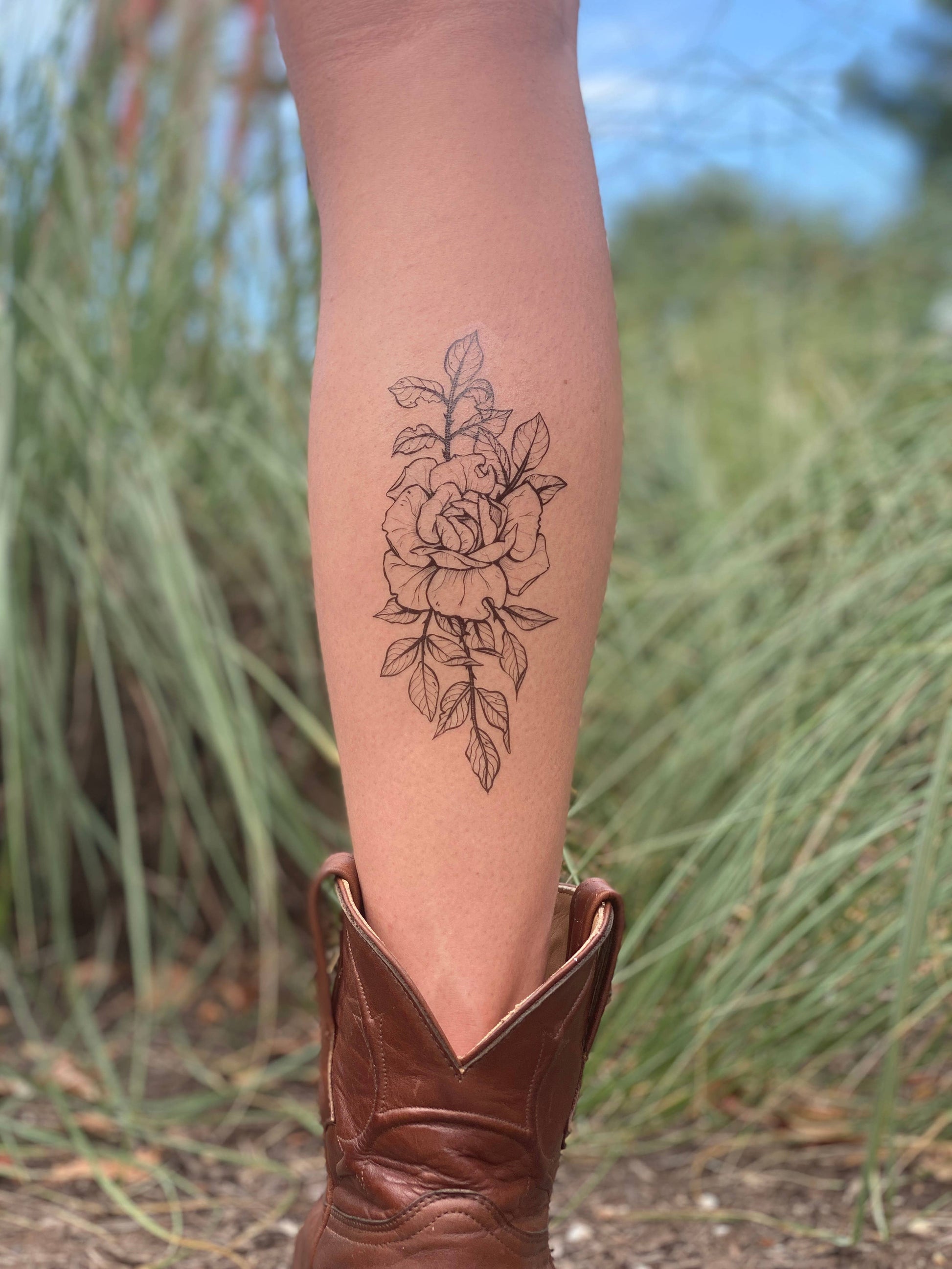 Rose Blossom temporary tattoo. A rose with round petals, freshly clipped from the garden with several leaves and stems attached. She's 6" long