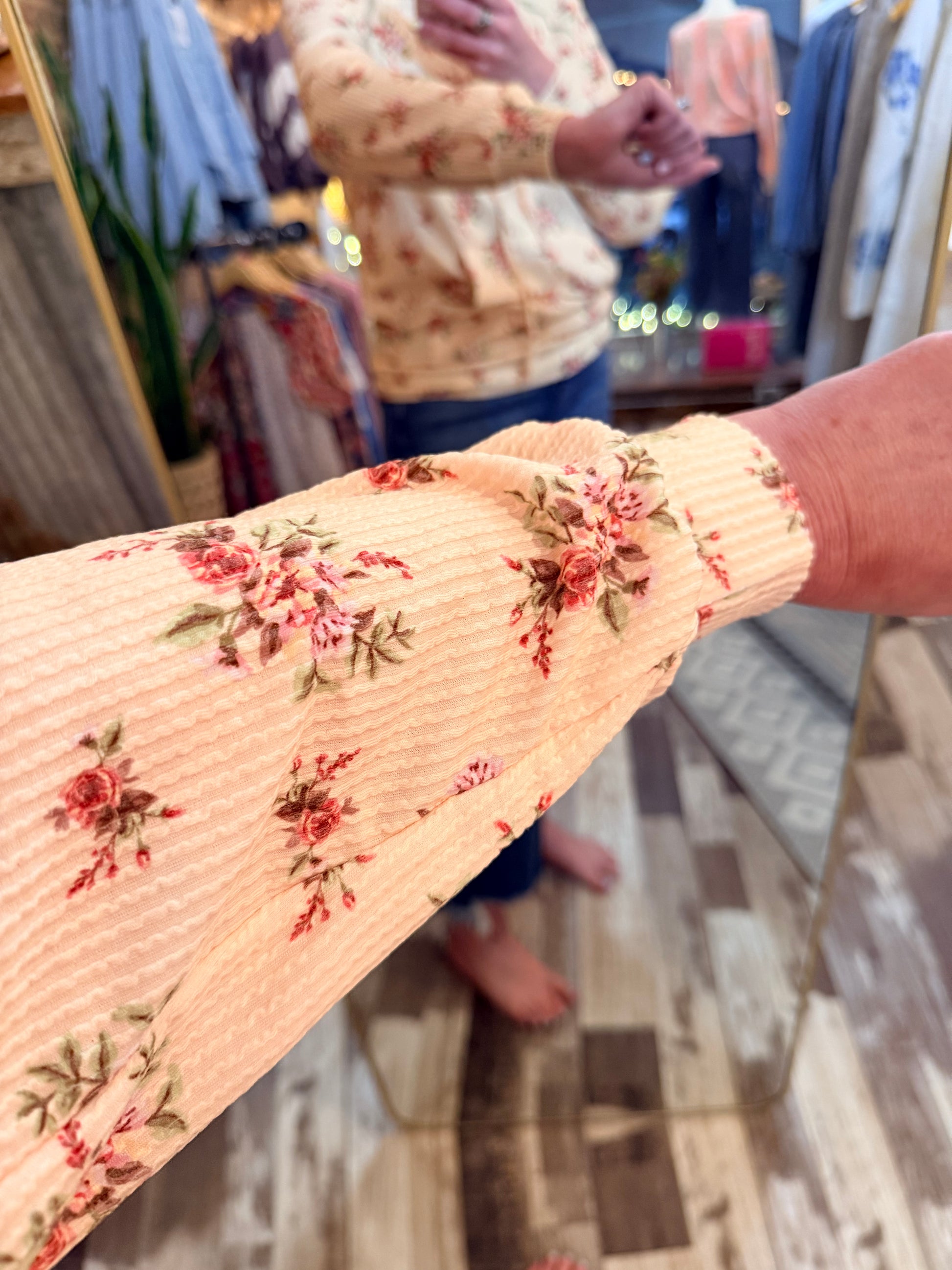 Cozy meets charming in this floral hoodie, crafted from ultra-soft ribbed knit fabric. Featuring a delicate allover rose print, it offers a relaxed fit with a front kangaroo pocket, drawstring hood, and long sleeves. 95% Polyester 5% Spandex