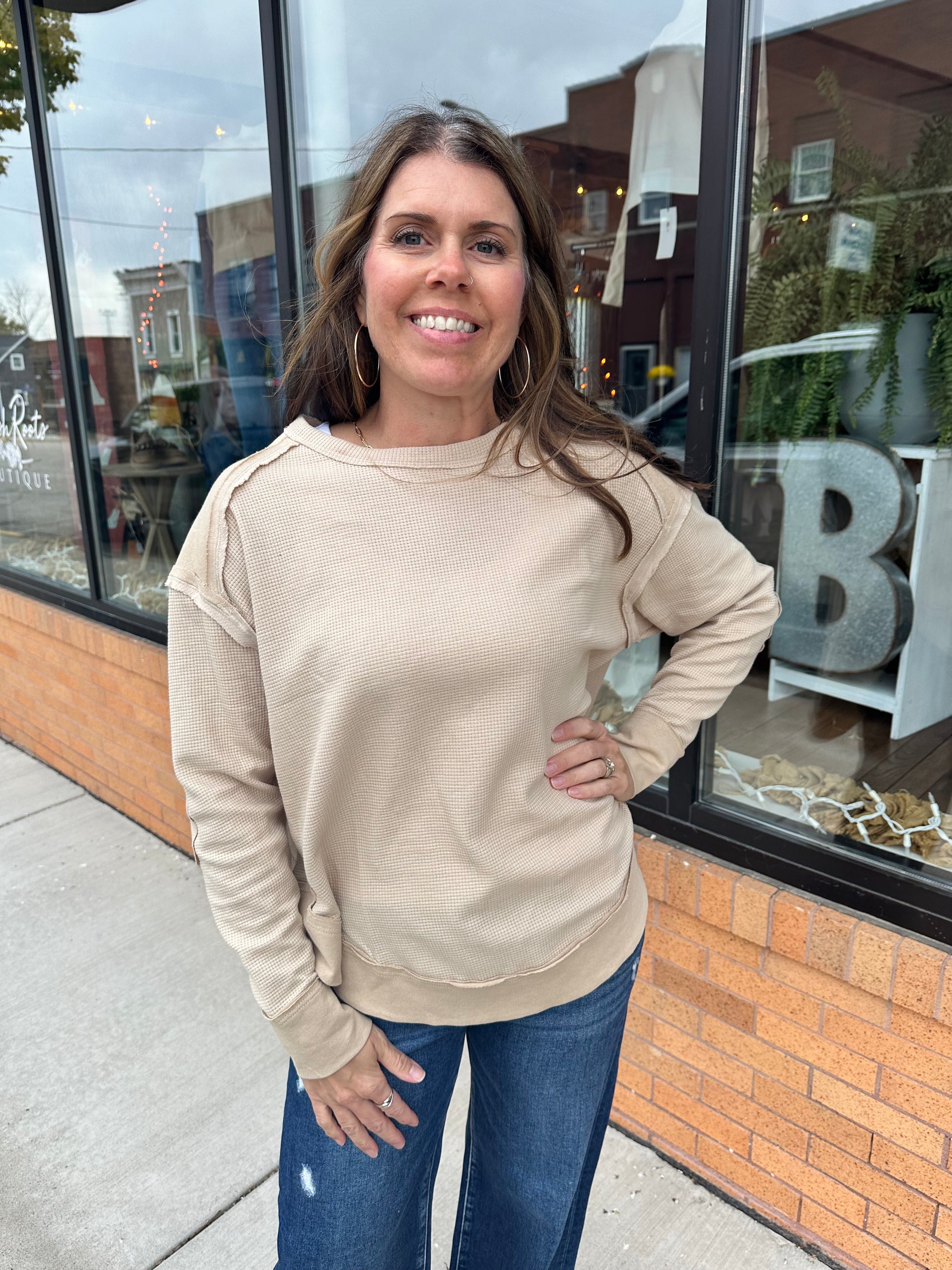 Introducing The Ellie—your new go-to for effortless cool! This oversized knit top features charming elbow patches in contrasting colors that add instant character and vintage vibes. The mineral wash gives it that perfectly lived-in feel, while the long sleeves and round neckline keep things cozy and classic. Raw edge details and a rounded hem complete the laid-back aesthetic. Whether you're layering it over a tee or wearing it solo, The Ellie brings personality and comfort to your everyday rotation.