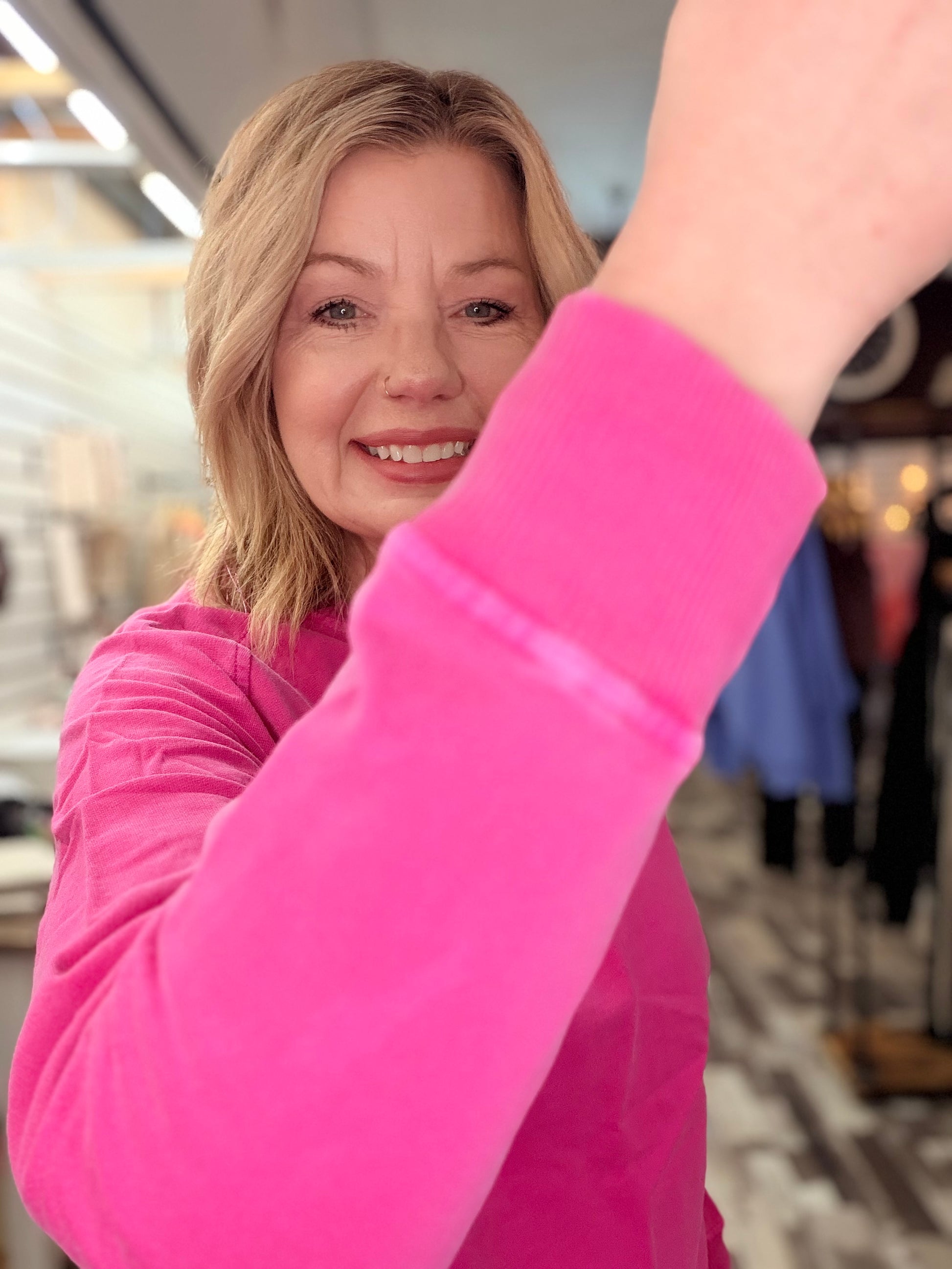 Elevate your cozy game with this mineral-washed sweatshirt that's giving effortless cool. The side ribbed detailing adds a touch of dimension and structure, while the soft, lived-in finish keeps things laid-back and chic. Perfect for those days when you want comfort without compromising on style. Throw it on with your favorite jeans and watch the compliments roll in! Kari is in the Med.