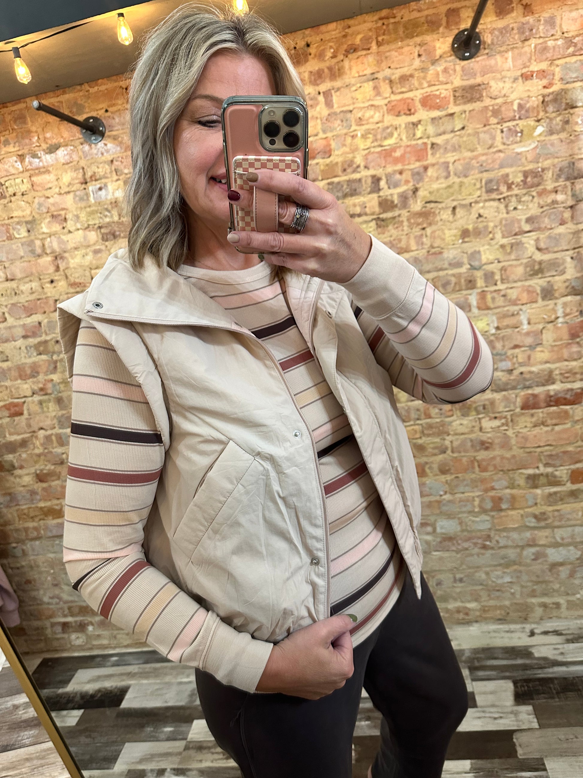 This lightweight vest features a structured silhouette with subtle quilting and a mock neckline for a modern edge. Designed with wide armholes, it layers effortlessly over any outfit without adding bulk. Includes a zipper closure and snap buttons for added functionality while maintaining its clean, minimal look. A closet staple for transitional weather and easy layering.