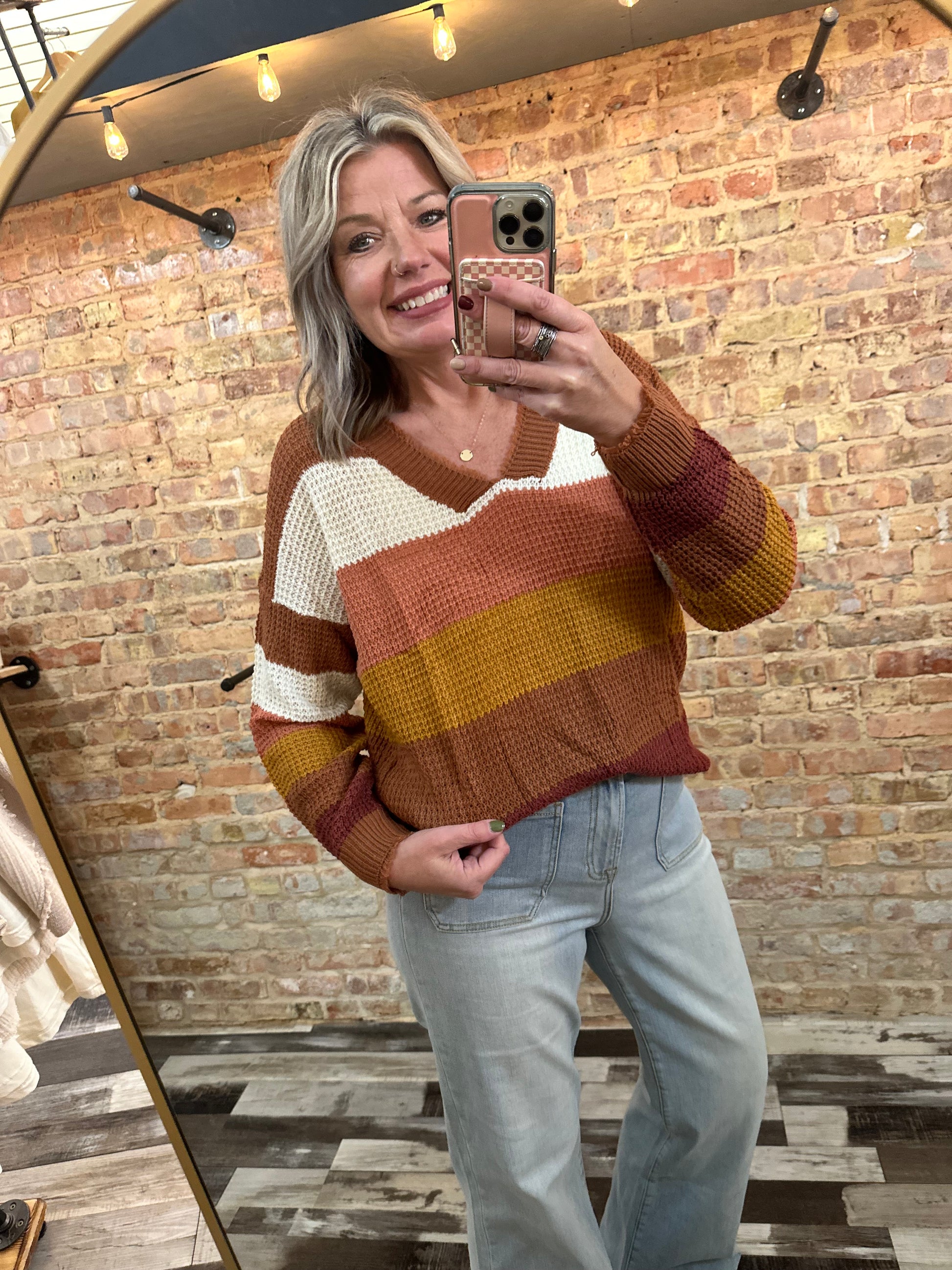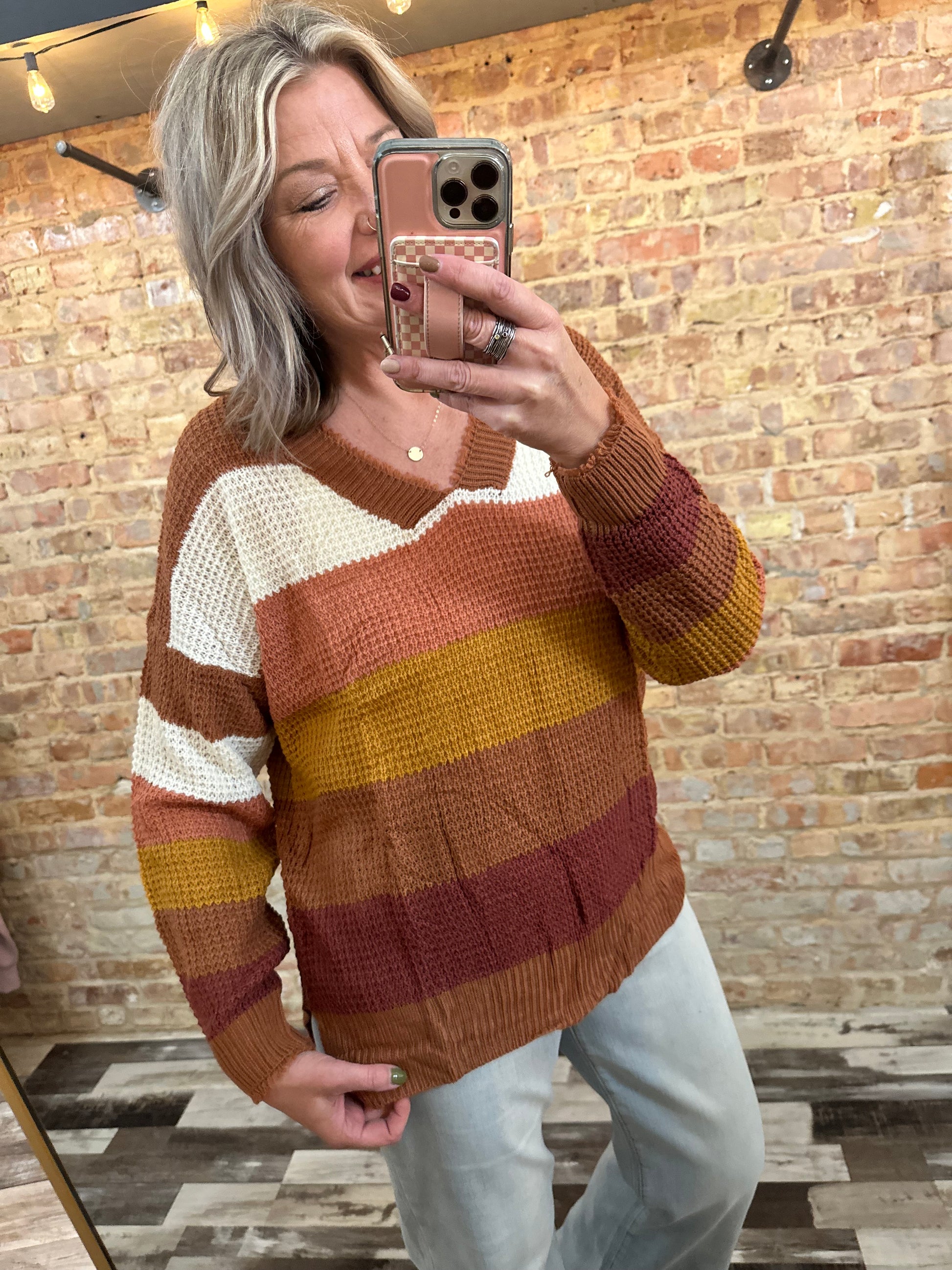 Brighten your wardrobe with the Karissa Colorblock Sweater—a playful mix of vibrant stripes and cozy knit. Its unfinished V-neck and side slits add a relaxed vibe, perfect for layering or solo style. This fun, colorful pullover is your new go-to for effortless comfort with a twist.