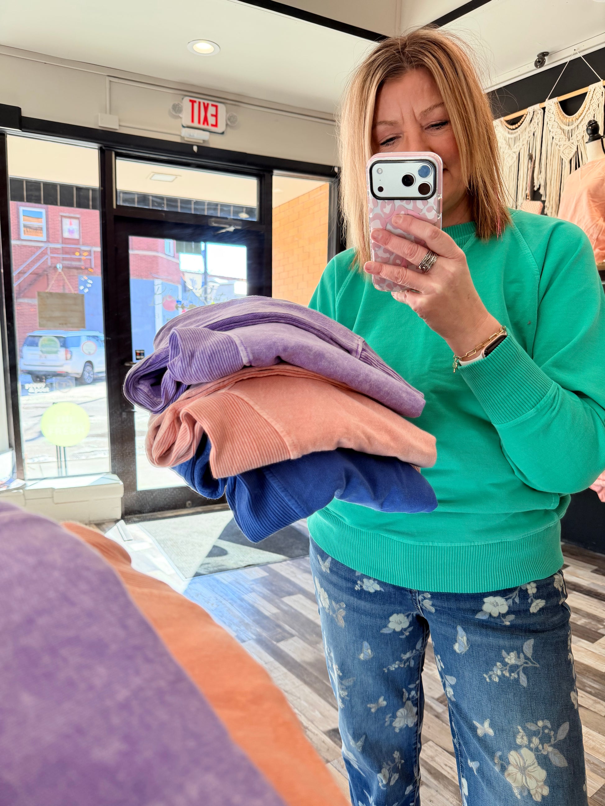 Cozy up in style with The Julia, our acid-washed sweatshirt that's giving major laid-back vibes. The unique side rib detailing adds an unexpected twist to a classic silhouette, making this piece stand out from your everyday basics. Soft, comfortable, and effortlessly cool—perfect for those days when you want to look put-together without trying too hard. Layer it, dress it down, or make it your go-to weekend uniform.