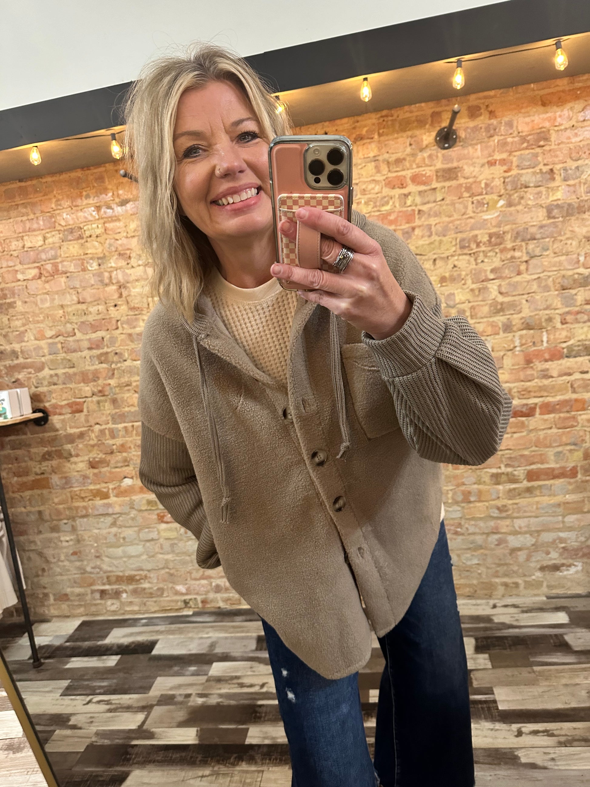 Cozy meets cool in the Tara Rib Knit Contrast Sherpa Hooded Shacket! With its soft faux sherpa body and rib knit hood and puff sleeves, it wraps you in warmth while keeping style fun. The adjustable drawstring hood lets you customize your look, and the curved hem adds a flirty twist to this perfect layering piece.