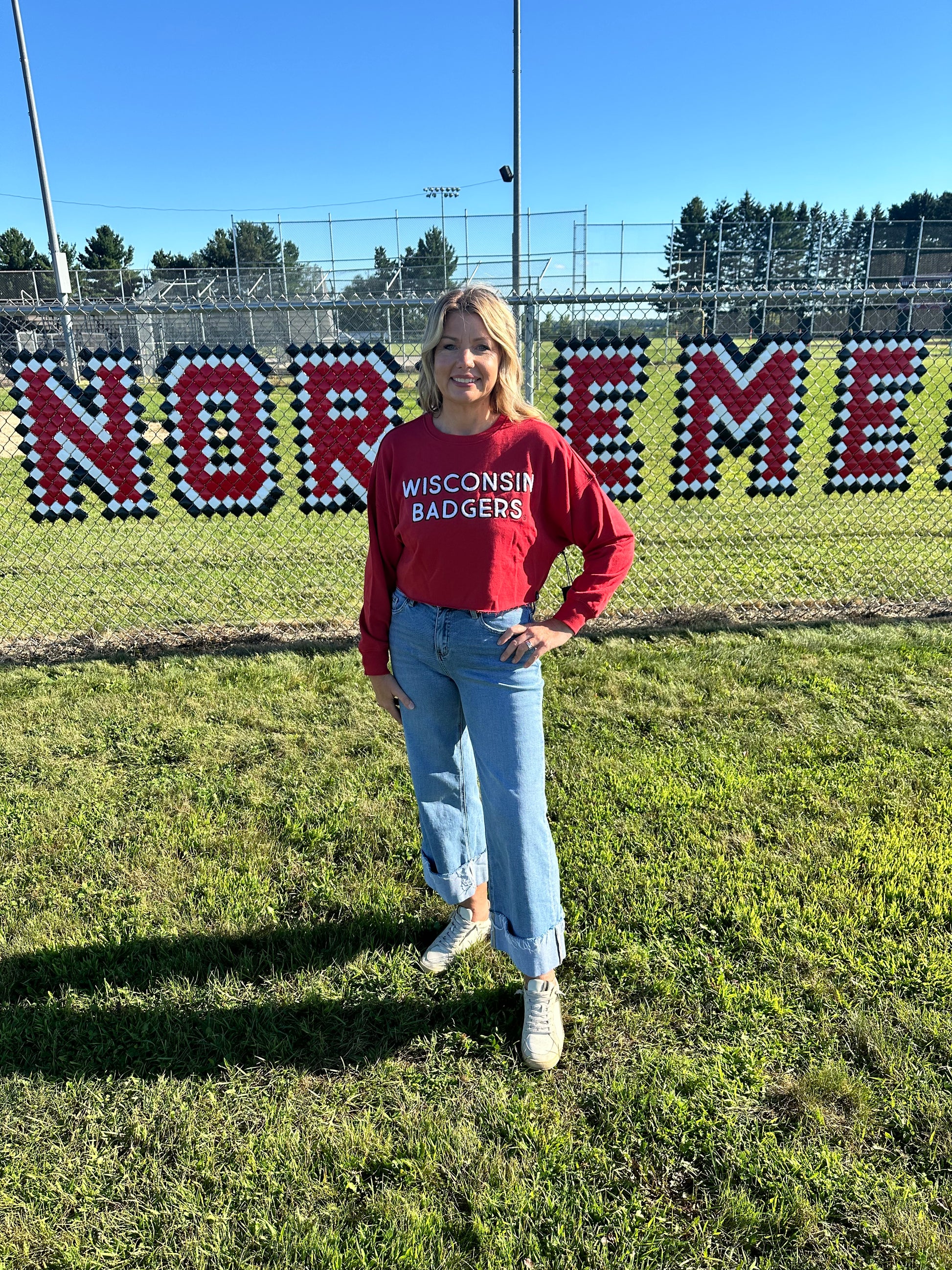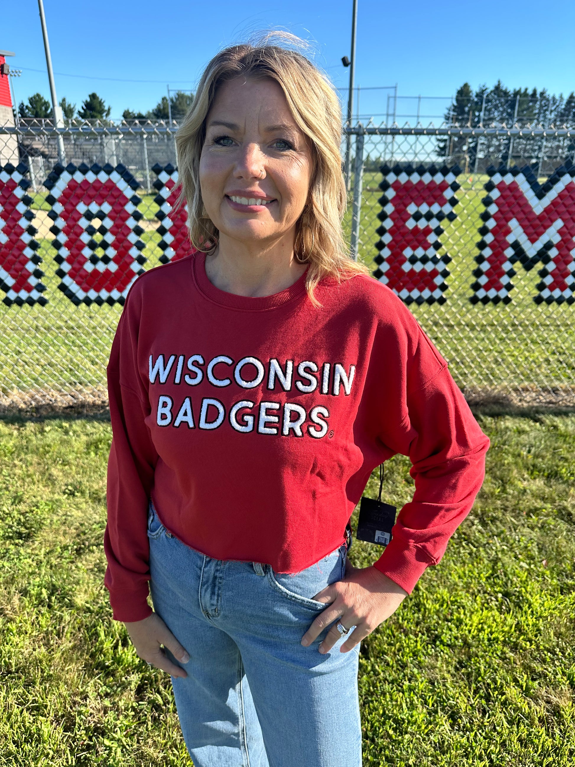 Our Cropped Long Sleeve Crewneck! A GDS favorite featuring a raw hem, dropped shoulder, and the perfect lightweight material. It fits like a dream and adds a girly touch to your collegiate wardrobe. Pairs well with denim shorts and cowboy boots for game day! Kari is in her true size medium.