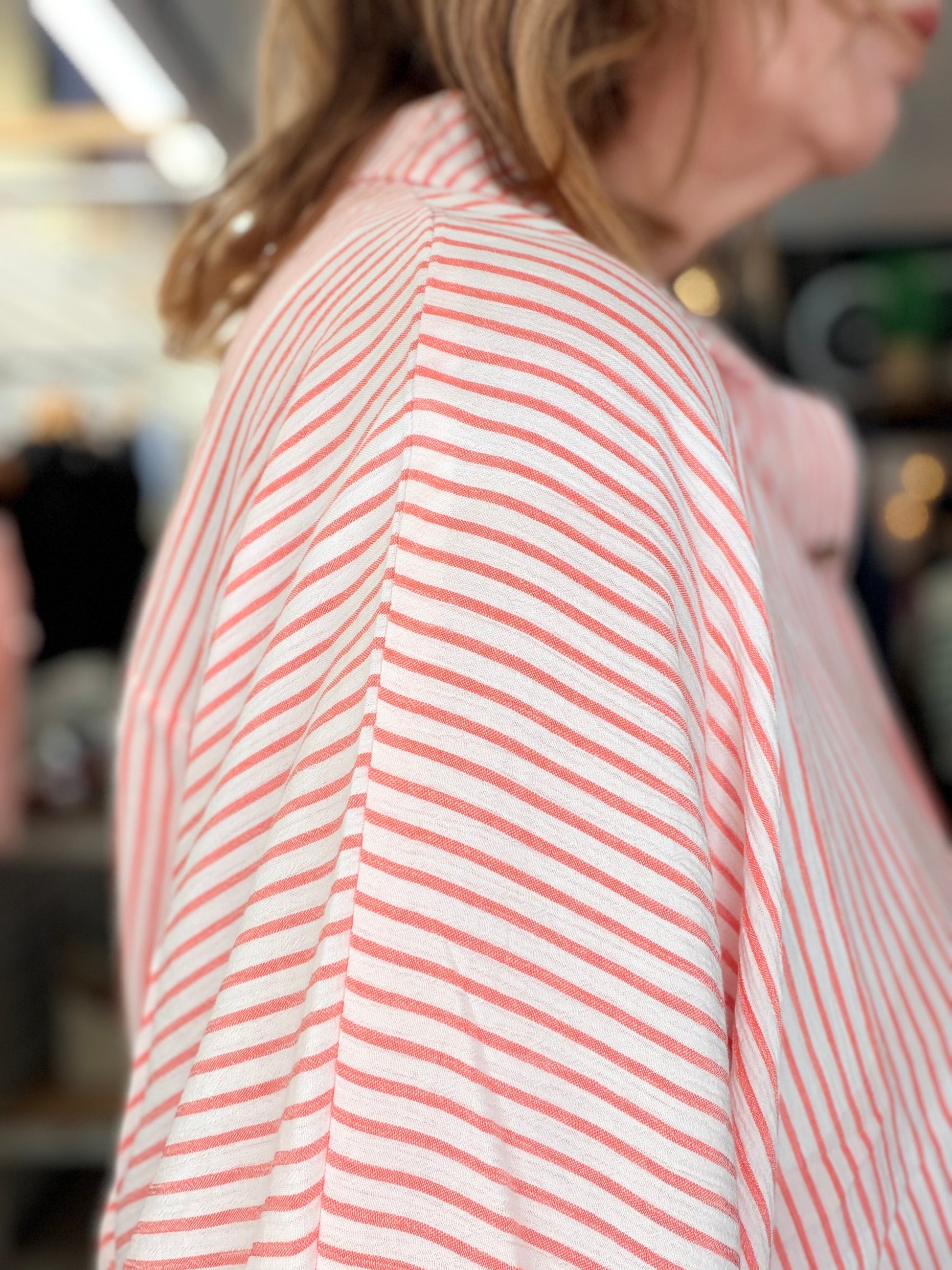 Effortless style meets comfort in this woven stripe button-down top. The oversized silhouette drapes beautifully while the curved hem adds a modern touch. Front button closure allows for easy layering and styling versatility. Perfect for casual days or dressed-up occasions.
